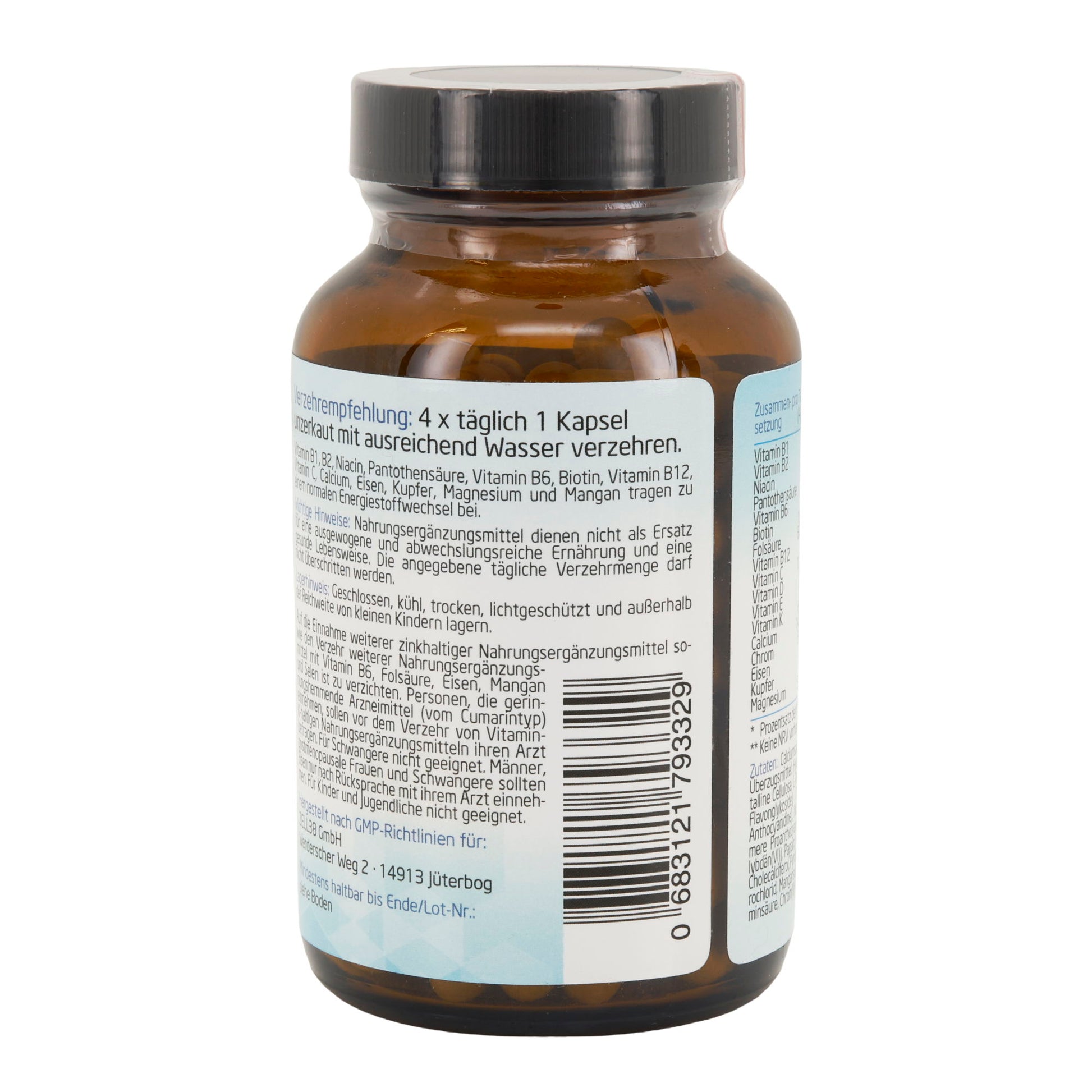 Calciumsalze der Zitronensäure, Magnesiumsalze der Zitronensäure, Überzugsmittel: Hydroxypropylmethylcellulose (Kapselhülle), Mikrokristalline Cellulose, L-Ascorbinsäure, Eisengluconat, Ginkgo bilobablatt-Extrakt (24% Flavonglykoside), DL-alpha-Tocopherylacetat, Heidelbeerfrucht-Extrakt (25% Anthocyanidine), Nicotinamid, Zinkcitrat, Weintraubenkern-Extrakt (50% OPC), Calcium-D-pantothenat, Natriummolybdat, Papain, Bromelain (Ananas), Coenzym Q10, Rote Beetewurzelpulver, Cholecalciferol, Pyridoxinhydrochlorid, Tomaten-Extrakt (5% Lycopin), Thiaminhydrochlorid, Mangansulfat, Kupfercitrat, Riboflavin, Phylloquinon, Pteroylmonoglutaminsäure, Chrom(III)-chlorid, D-Biotin, Natriumselenit, Cyanocobalamin.