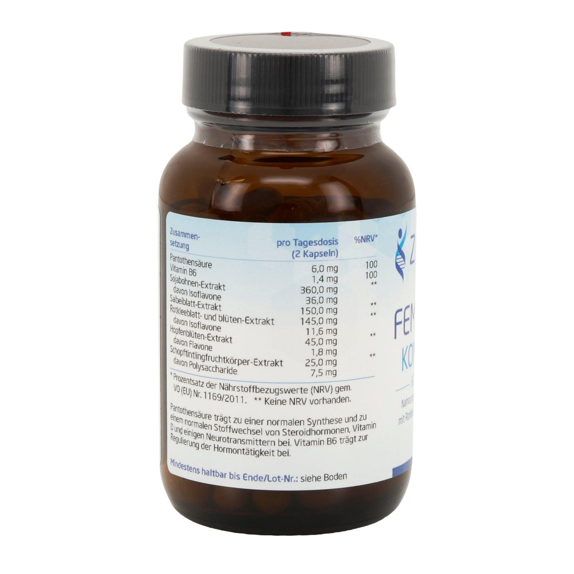 Sojabohnensamen-Extrakt (Glycine max; 10% Isoflavone), Salbeiblatt-Extrakt (Salvia officinalis; 2% Ätherische Öle), Überzugsmittel: Hydroxypropylmethylcellulose (Kapselhülle), Rotkleeblatt- und -blüten-Extrakt (Trifolium pratense; 8% Isoflavone), Hopfenblüten-Extrakt (Humulus lupulus; 4% Flavone), Schopftintlingfruchtkörper-Extrakt (Coprinus comatus; 30% Polysaccharide), Calcium-D-pantothenat, Pyridoxal-5'-phosphat (P-5-P).