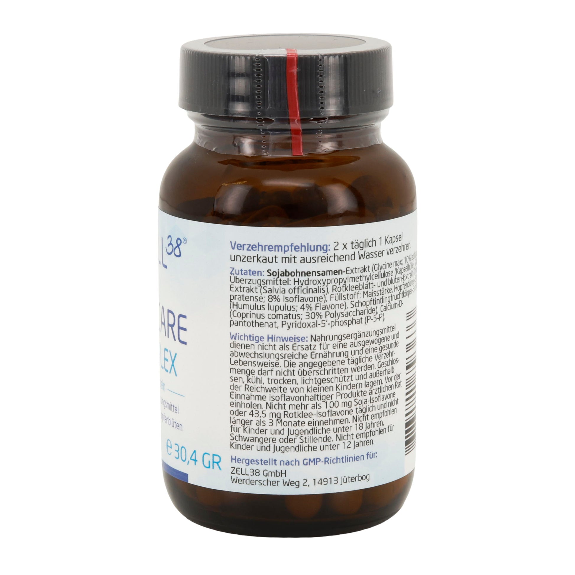 Zutaten Sojabohnensamen-Extrakt (Glycine max; 10% Isoflavone), Salbeiblatt-Extrakt (Salvia officinalis; 2% Ätherische Öle), Überzugsmittel: Hydroxypropylmethylcellulose (Kapselhülle), Rotkleeblatt- und -blüten-Extrakt (Trifolium pratense; 8% Isoflavone), Hopfenblüten-Extrakt (Humulus lupulus; 4% Flavone), Schopftintlingfruchtkörper-Extrakt (Coprinus comatus; 30% Polysaccharide), Calcium-D-pantothenat, Pyridoxal-5'-phosphat (P-5-P). Zusammensetzung pro Tagesdosis (2 Kapseln)...