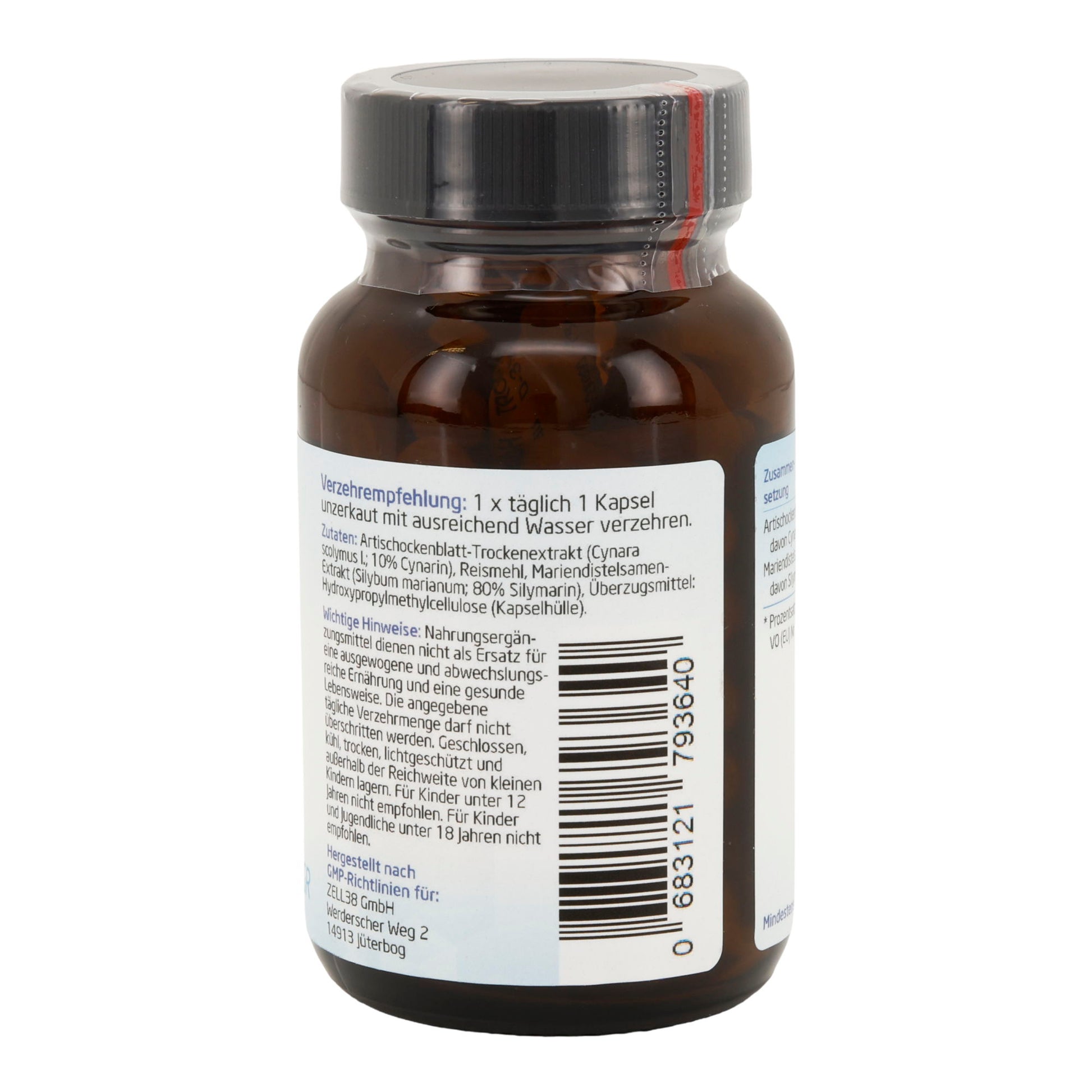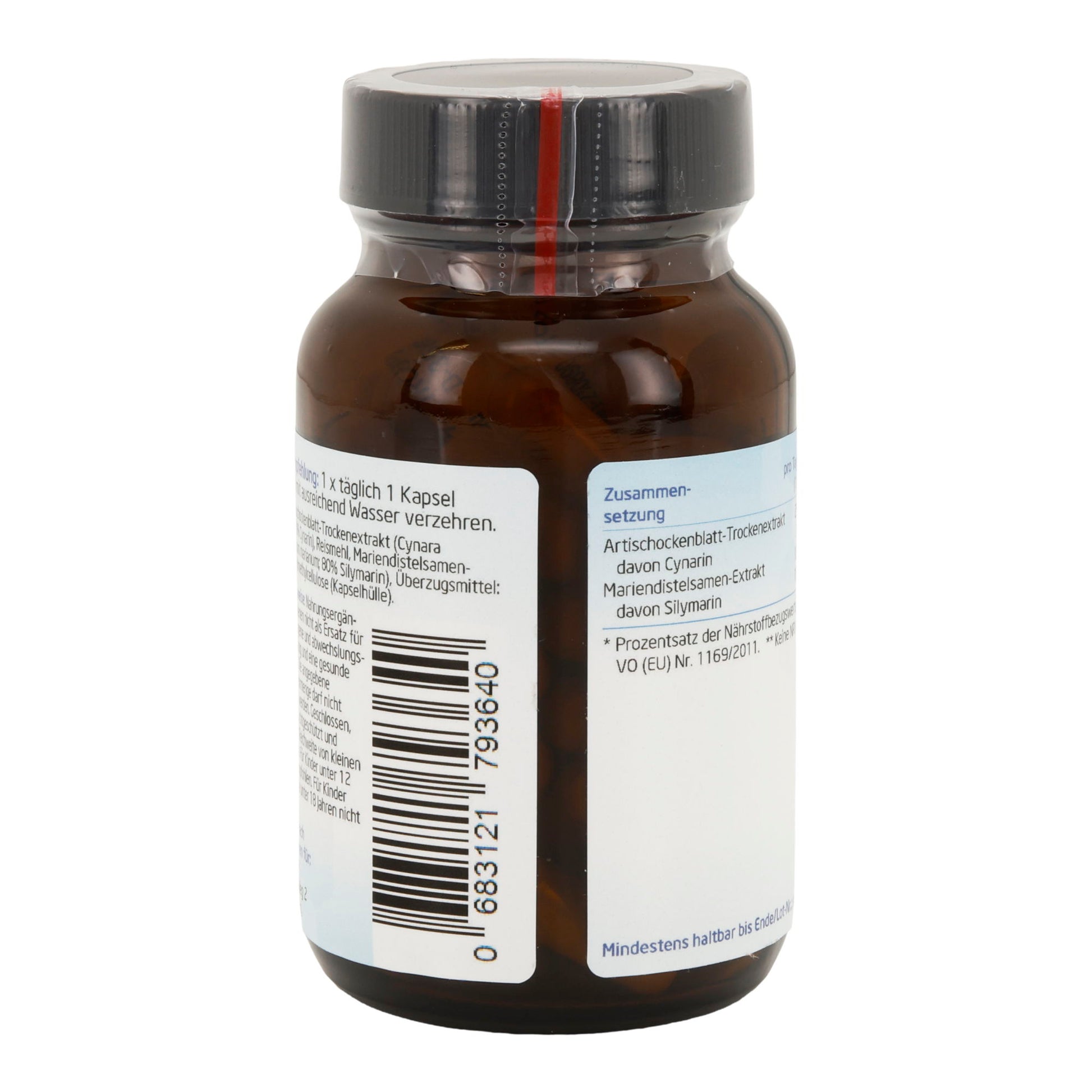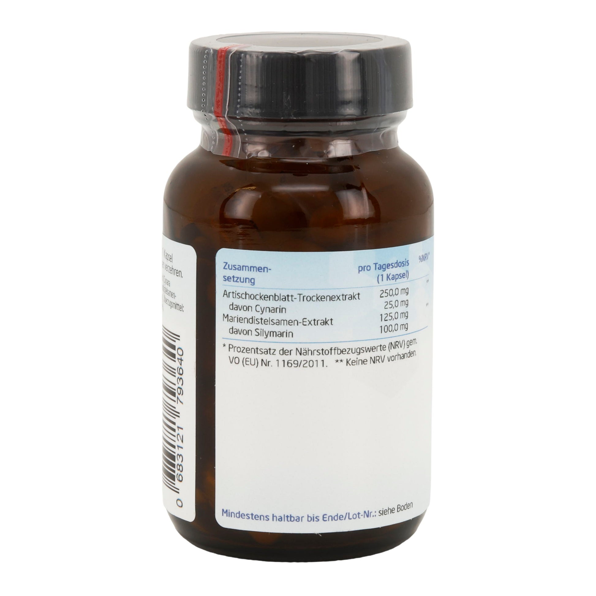 Zutaten Artischockenblatt-Trockenextrakt (Cynara scolymus L.; 10% Cynarin), Reismehl, Mariendistelsamen-Extrakt (Silybum marianum; 80% Silymarin), Überzugsmittel: Hydroxypropylmethylcellulose (pflanzliche Kapselhülle). Zusammensetzung pro Tagesdosis (1 Kapsel) Inhaltsstoff Menge %NRV* Artischockenblatt-Trockenextrakt 250,0 mg ** – davon Cynarin 2,5 mg ** Mariendistelsamen-Extrakt 125,0 mg ** –...