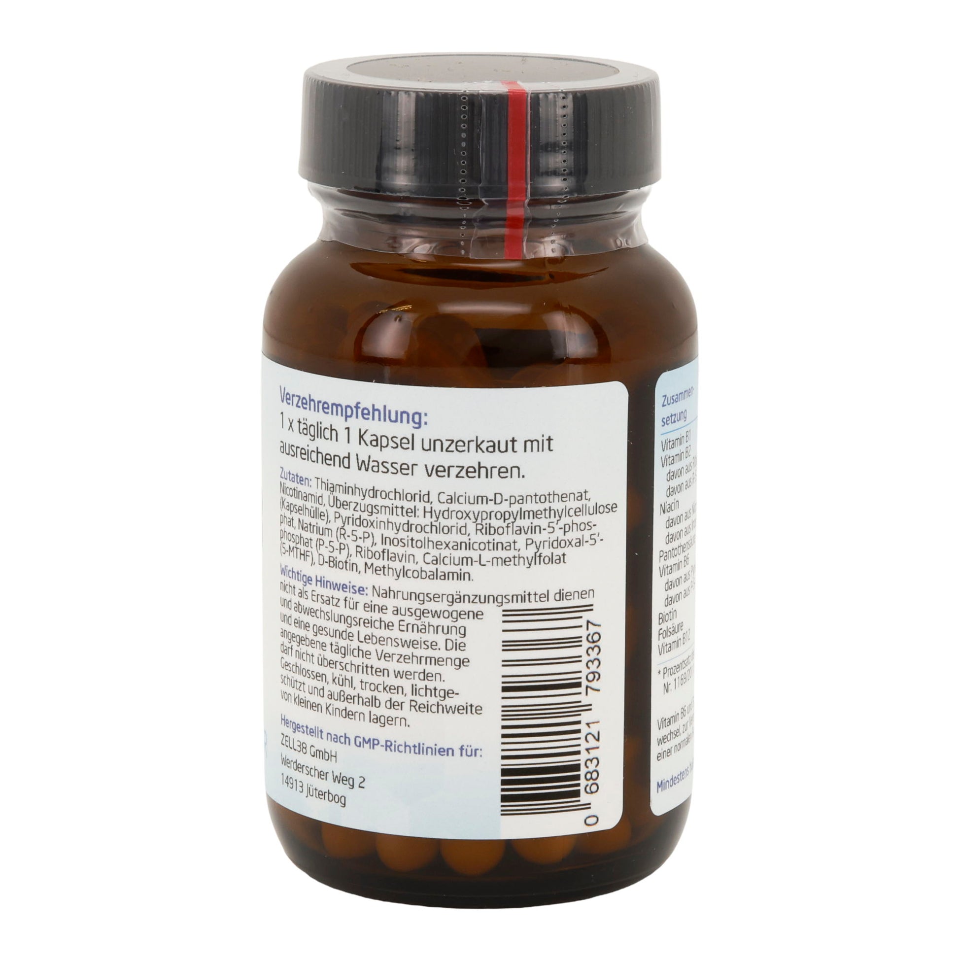 Thiaminhydrochlorid, Calcium-D-pantothenat, Nicotinamid, Überzugsmittel: Hydroxypropylmethylcellulose (pflanzliche Kapselhülle), Pyridoxinhydrochlorid, Riboflavin-5′-phosphat Natrium (R-5-P), Inositolhexanicotinat, Pyridoxal-5′-phosphat (P-5-P), Riboflavin, Calcium-L-methylfolat (5-MTHF), D-Biotin, Methylcobalamin.