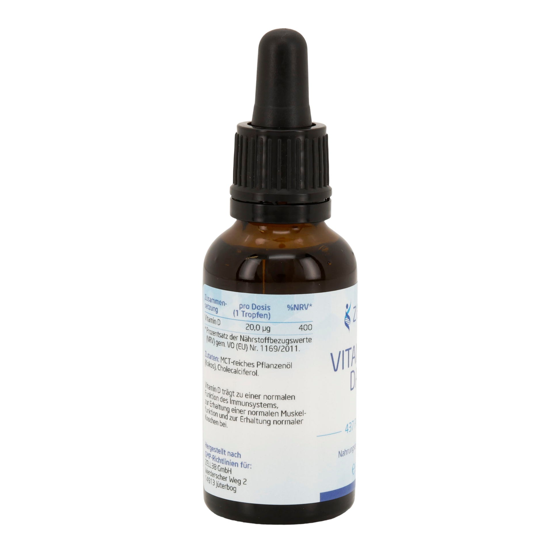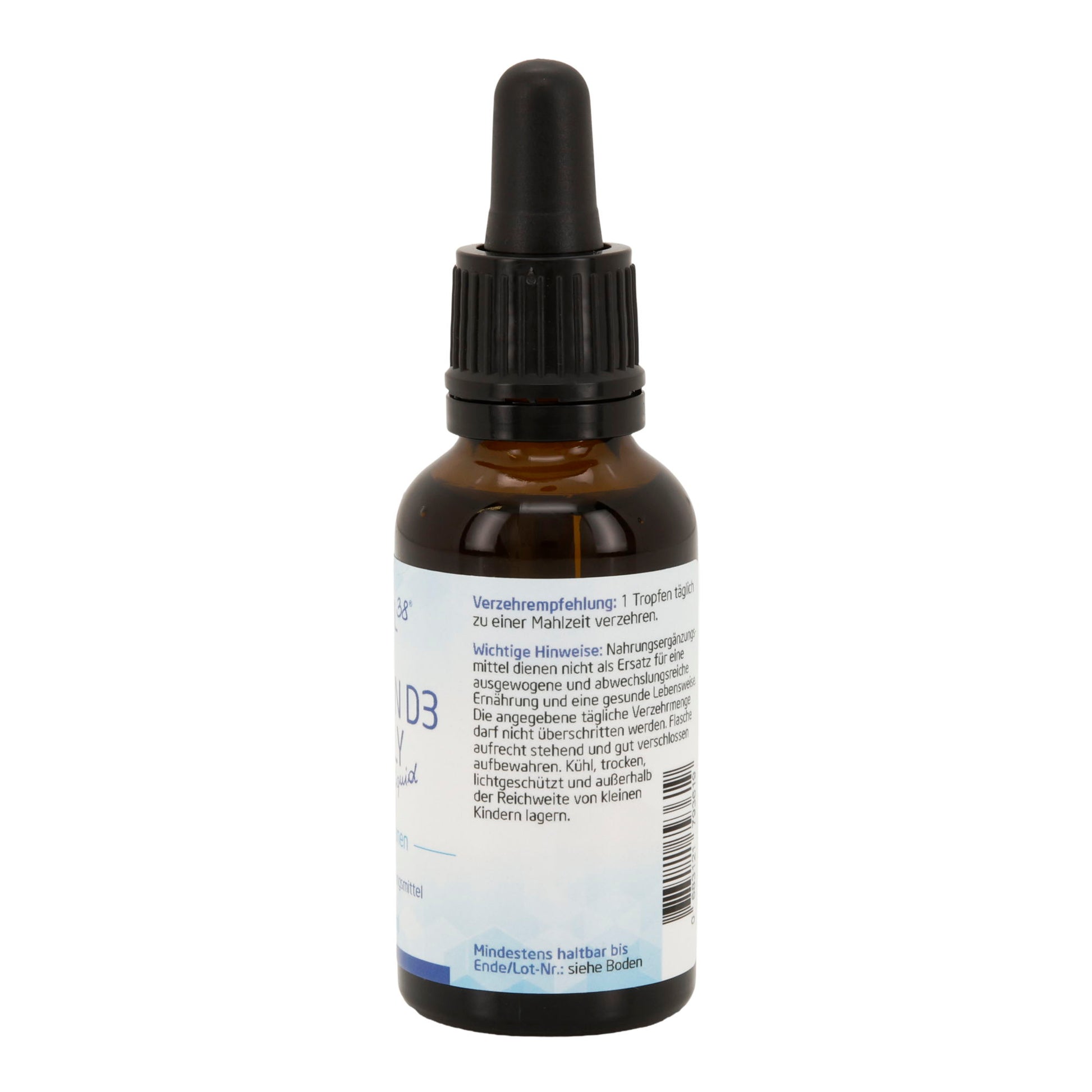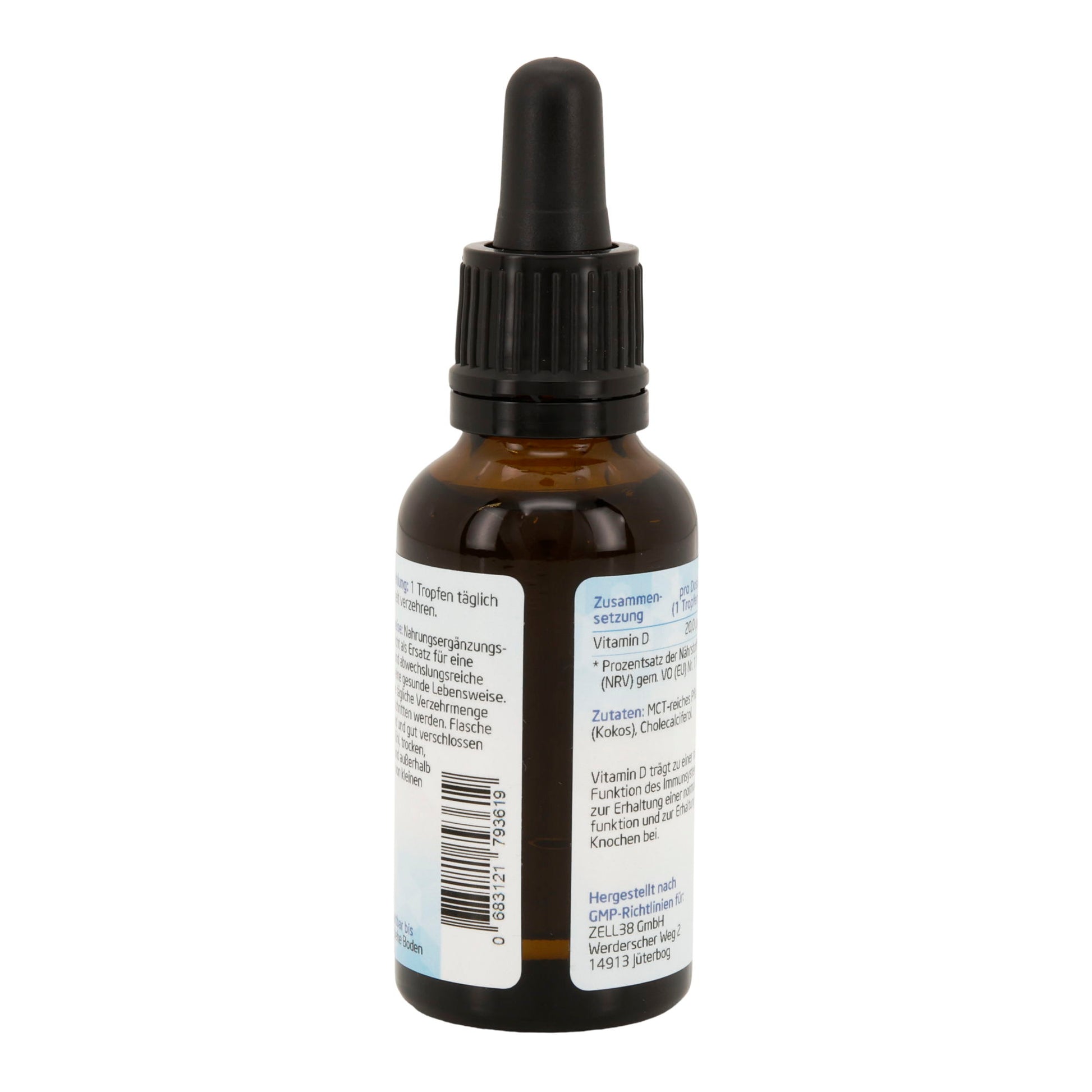 Zutaten MCT-reiches Pflanzenöl (Kokos), Cholecalciferol (Vitamin D3). Zusammensetzung pro Tagesdosis (1 Tropfen) Inhaltsstoff Menge %NRV* Vitamin D (Cholecalciferol) 20 µg (800 I.E.) 400% * Prozentsatz der Nährstoffbezugswerte gemäß VO (EU) Nr. 1169/2011 Lagerhinweise Flasche stets gut verschließen und aufrecht lagern. Kühl, trocken, lichtgeschützt...